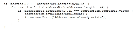 The following code ensures that an address ID CANNOT be used if it is already in use by another address in the customer's address book. There is a problem with the code. The error message for an invalid address ID is never shown to the user on the form field.