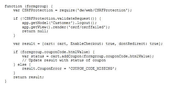 Universal Containers recently completed updates to their storefront shopping cart page. A problem has been discovered since the update. Users are no longer able to submit coupon codes on this page. Additionally, authenticated users who try to add a coupon are logged out.