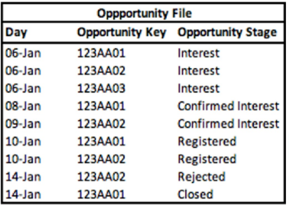 Given the above file and logic and assume that the file is mapped in the OPPORTUNITIES Data Stream type with the following mapping: