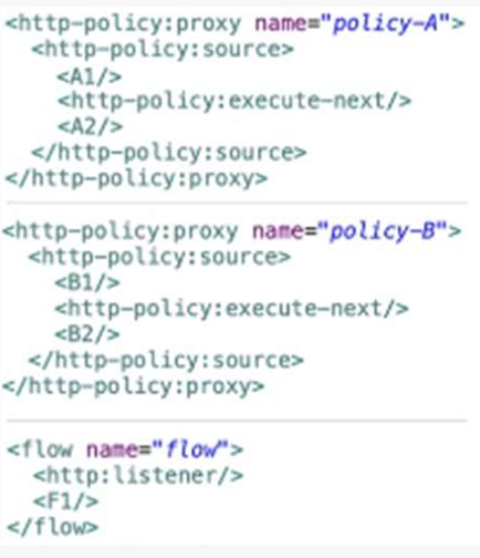 A Mule application contain two policies Policy A and Policy A has order1, and Policy B has order 2. Policy A Policy B, and a flow are defined by he configuration below.