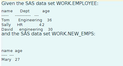 The following code is submitted: data WORK.FINAL_EMPS; set WORK.EMPLOYEE WORK.NEW_EMPS; run; proc print data=WORK.FINAL_EMPS; title 'The RESULTS Data Set'; run; What is the resulting data set?
