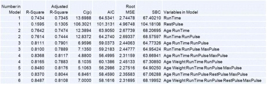 SAS output from the RSQUARE selection method, within the REG procedure, is shown. The top two models in each subset are given.