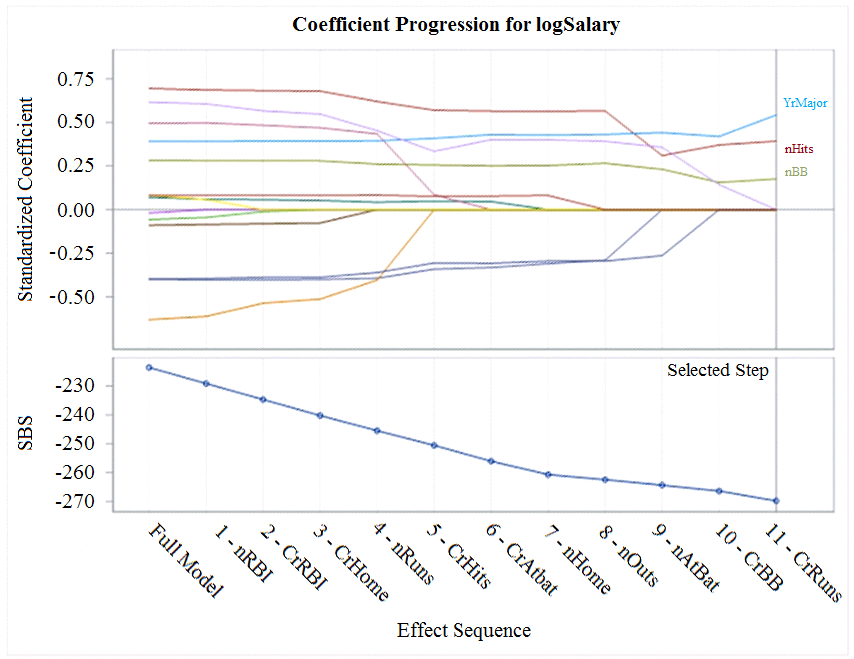 PROC GLMSELECT was used for building a model predicting the natural log of a baseball player's salary from certain performance and longevity statistics. The model used backward elimination using SBC as its selection criterion. The sequence of steps is summarized in the graphic shown below: