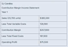 SJ Candles is performing a cost-volume-profit analysis to prepare for year 2. Fixed costs are expected to remain the same as year 1, but variable costs per unit are expected to increase by 10%. They plan to keep the same sales price but want to know what level of sales must be achieved in year 2 to maintain the same operating profit.