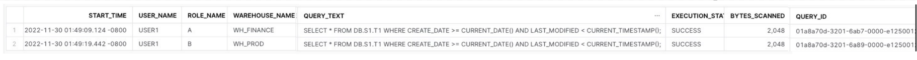 The Administrator found the two relevant queries from the SNOWFLAKE. ACCOUNT_USAGE. QUERY_HISTORY view: