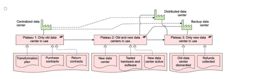 The program manager overseeing the data center transformation has asked you to model an outline of the implementation plan which has three stable states defined. You should show the deliverables associated with each plateau in connection