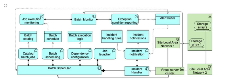 The relationships between components are modeled using ArchiMate 3 standards, such as flow relationships between the Batch Monitor and Alert Buffer or between the Incident Handler and storage components.