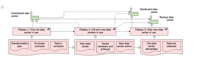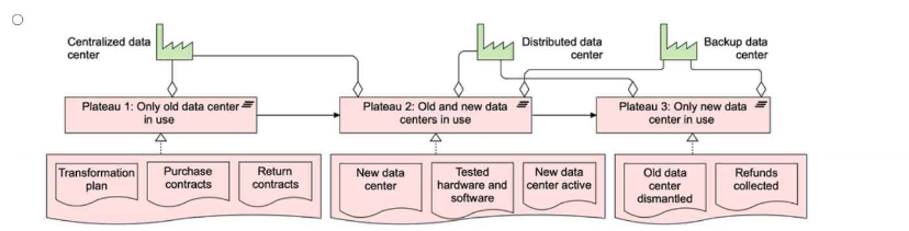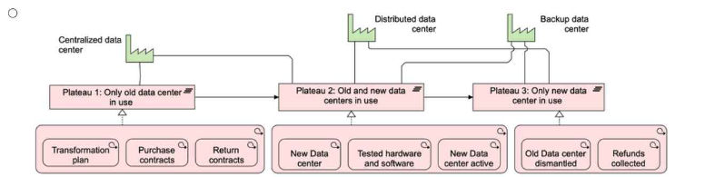 Plateaus: Plateaus represent intermediate stable states within an architecture transformation, showing the condition of the architecture at specific moments in time. In this scenario, the plateaus correspond to the stable data center configurations at different phases: