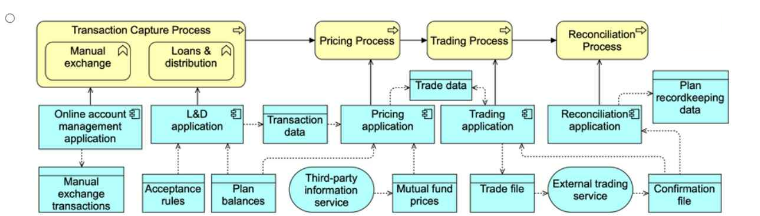 Option B provides the most complete and accurate representation of the scenario. It captures the business processes (Transaction Capture, Pricing, Trading, Reconciliation) and their sub-processes, while showing the appropriate connections to the applications that support these processes.