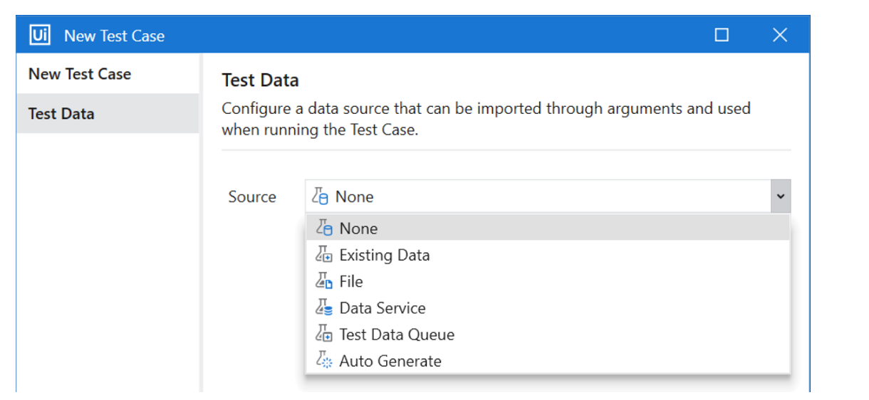 When creating a new test case in UiPath Studio, you can configure a data source that can be imported through arguments and used when running the test case. You can choose from different options for the data source, such as File, Data Service, Test Data Queue, and Auto Generate. Each option has different implications for how the test data is updated in UiPath Orchestrator once the test case is published.