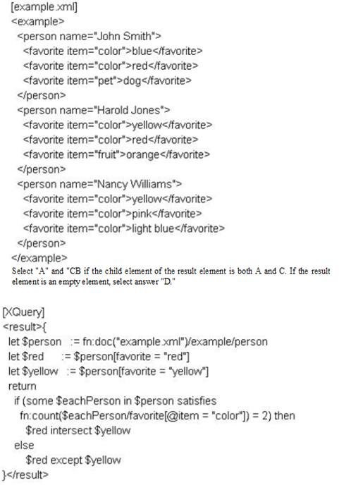 Select from choices A through C the answer that is included in the result element as the result of executing the [XQuery] on [example.xml] referenced in a separate window. (multiple answers possible) For example, select only "B" if the child element of the result element is "B" only.