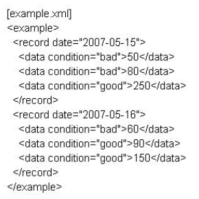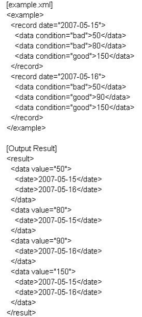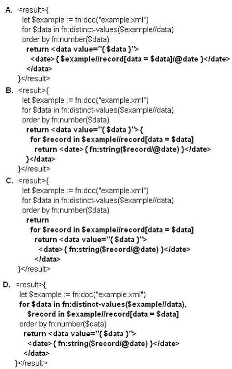 Assume you wish to execute an XQuery on [example.xml] (separate window) to obtain [Output Result] (separate window). Select the correct XQuery to obtain [Output Result].
